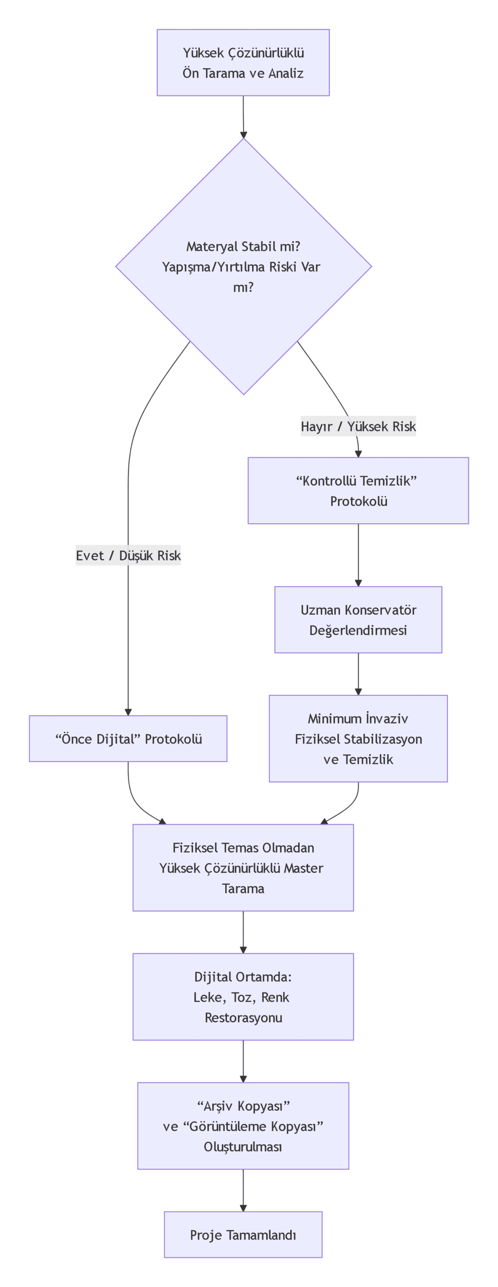 Cevap: Bu, restorasyon etiğinin en temel sorusudur. Cevabımız net: Hayır, kaybettirmez; aksine korur. Amacımız estetik “yenileme” değil, “konservasyon” yani korumadır. Yaptığımız minimal fiziksel müdahaleler (toz alma, asitsiz destek ekleme), nesneyi daha fazla bozulmaktan kurtarmak içindir ve hepsi geri döndürülebilir (reversible) prensiple yapılır. Ayrıca, ilk adımda aldığımız “Arşiv Master” taraması, orijinalin temizlik öncesi halinin daimi dijital kanıtıdır. Böylece hem fiziksel ömrü uzatılır, hem de orijinal durum hiçbir zaman kayıt dışı kalmaz.